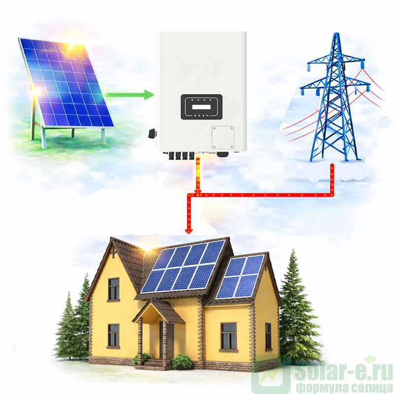 Сетевая солнечная электростанция состоит только из солнечных модулей и сетевого инвертора - аккумуляторы не требуются. В СЭС используется метод прямого преобразования солнечного излучения в электрическую энергию с ее последующей подачей в вашу электросеть. Система предназначена для уменьшения потребляемой энергии от центральной электросети, а также увеличения ее суммарной мощности. СЭС работает одновременно с вашей сетью, добавляя сгенерированную ею энергию на питание нагрузки.